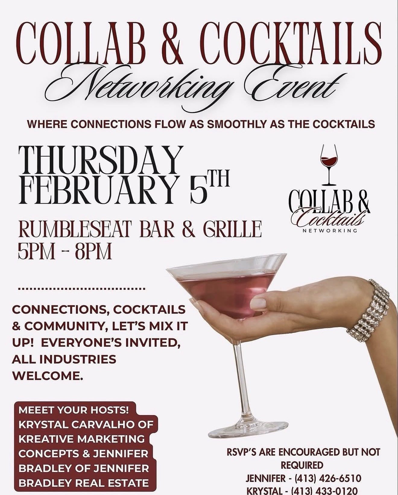 Collab & Cocktails is a fun, modern networking event series co-founded by Krystal Carvalho of Kreative Marketing Concepts and Jennifer Bradley of The Bradley Group Real Estate, a division of Benton Realty. We created Collab & Cocktails because we wanted networking in Western Massachusetts to feel more relaxed, more fun, and way less awkward.